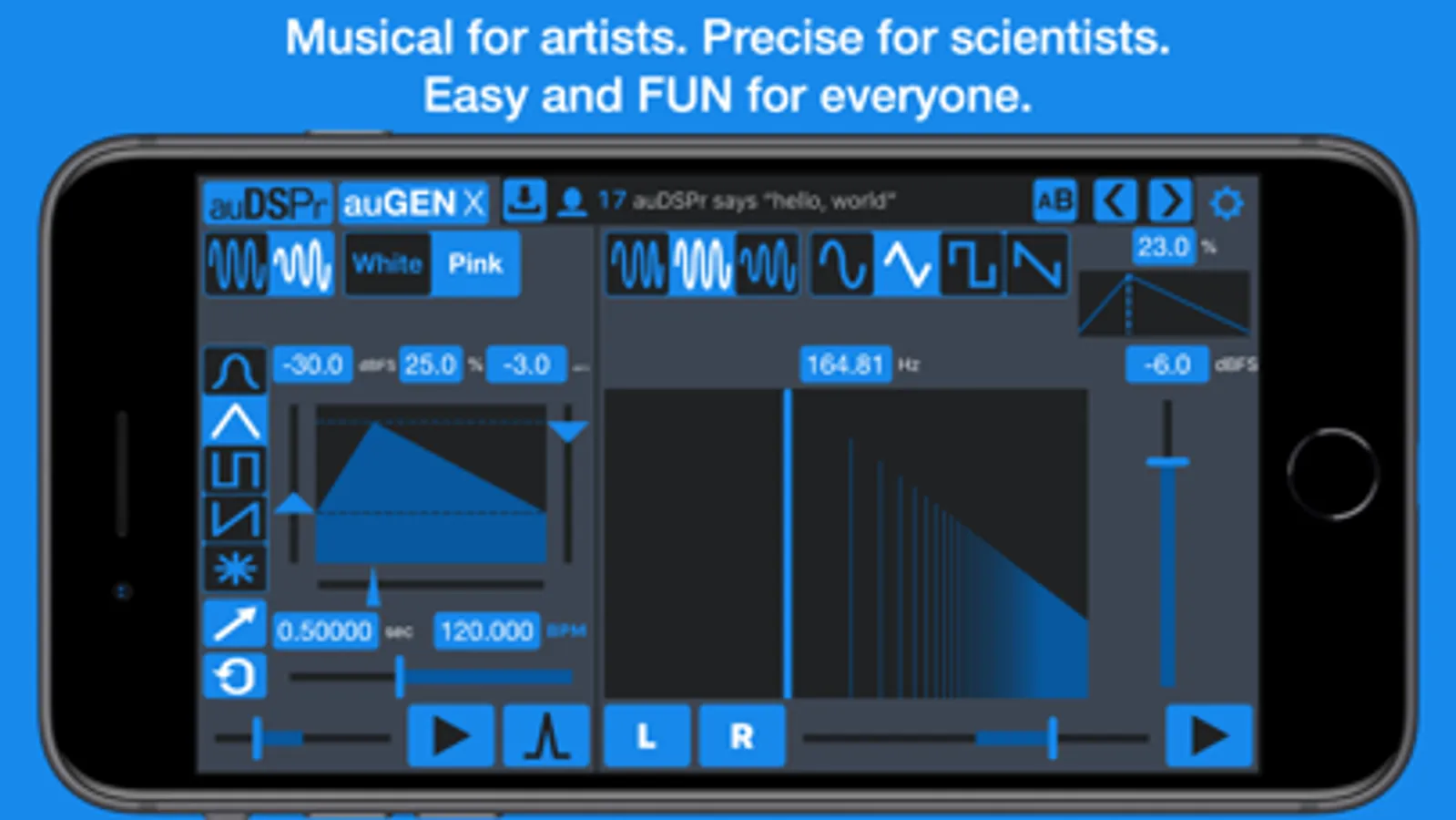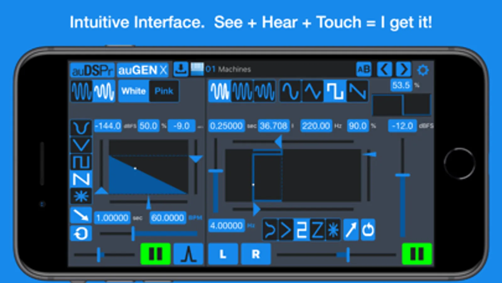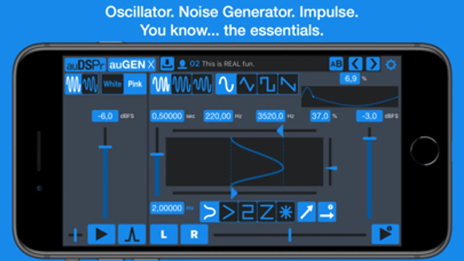 I started making this app because as an audio electronics engineer I could not find a single audio generator that does everything that I require AND is an AUv3 Audio Unit. auGEN X has expanded into a musical tool for exploring and learning sound design. Our goal is for auGEN X to be an Essential in your audio toolbox. We hope you enjoy it and we’re excited to hear the cool things that you do with auGEN X!