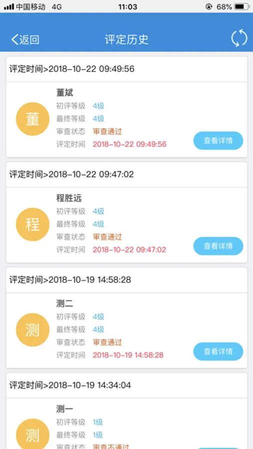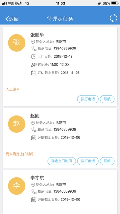 评定人员或专家可以通过APP接受评定任务派单,展示评定人员当前待护理任务列表,查看失能人员相关资料,根据评定标准和要求,进行现场评估,采集视频等资料信息,给出评估意见。