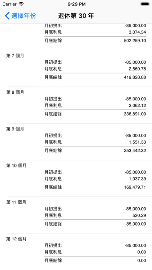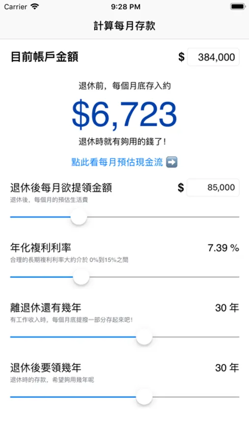 協助您規劃退休前,每個月應該存多少錢。在不同的年化複利利率之下,估算退休前/退休後的每個月的現金流量。