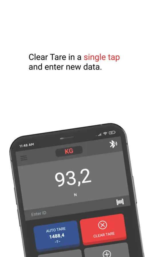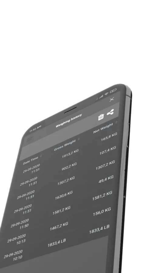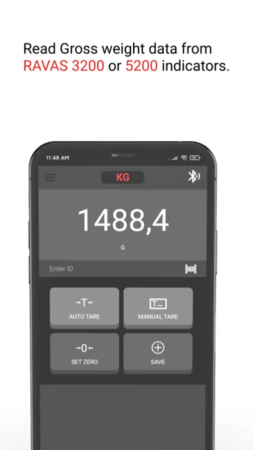 The RAVAS WeghtsApp works with RAVAS 3200 and 5200 indicators, both with Bluetooth 4.0 (BLE) data output. Once paired with the RAVAS indicator, the gross weight can be read directly on the APP. Tare weight can be entered in the APP as well as ID codes for Product and operator. These weight data are stored locally on the smartphone or tablet. You can view this list of data at any time and if required also send it by email to any email address. This list of data is sent as a CSV file and can be converted into a spreadsheet program of your choice on the PC.