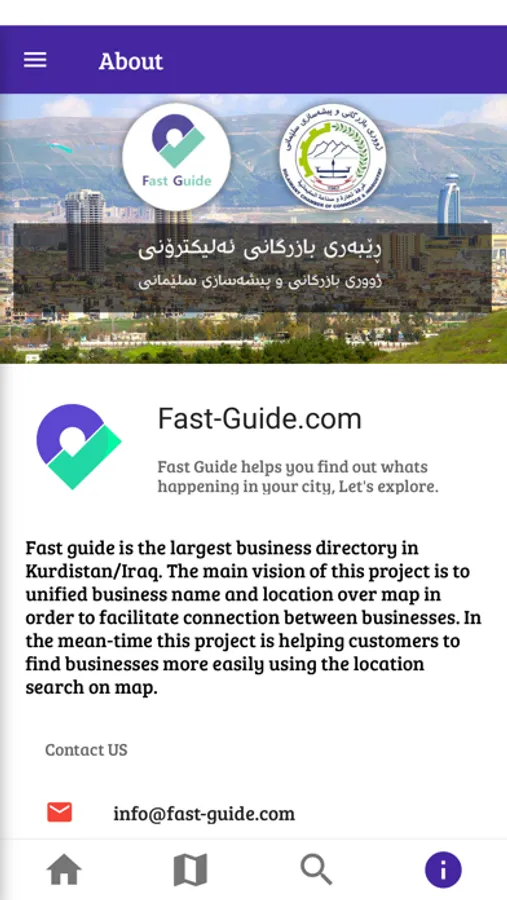 Fast guide is the largest business directory in Kurdistan/Iraq. The main vision of this project is to unified business name and location over map in order to facilitate connection between businesses. In the mean-time this project is helping customers to find businesses more easily using the location search on map.