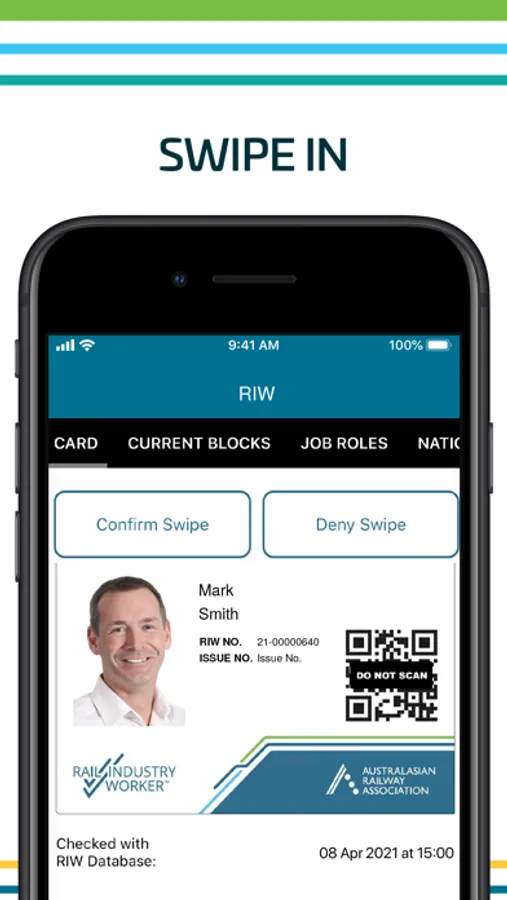 The RIW app allows an authorised person nominated by their organisation to scan a Rail Industry Worker Card (physical or virtual) to: