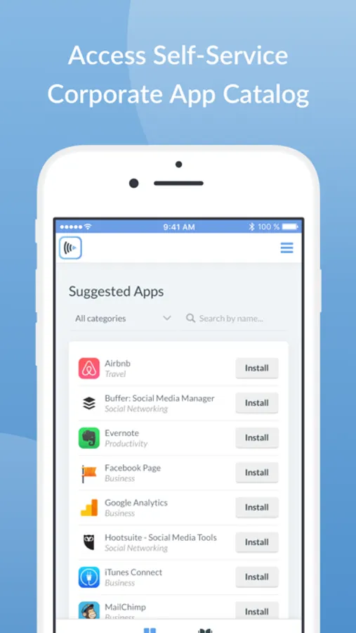 Using the Mosyle Business app, employees and Higher-Ed students have access to the self-service apps and books catalog, being able to install Suggested Applications as well as download Books onto their corporate iPhone and iPad devices. End-users can log into their Mosyle Business account by using the corporate access code provided by their company.