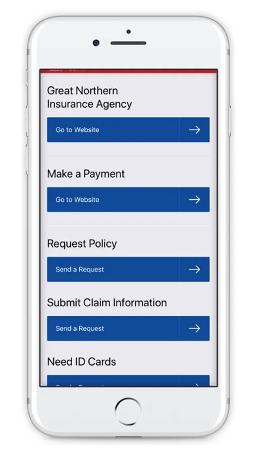 The Great Northern Insurance Agency app provides a simplified way for existing customers to perform actions such as Make a Payment, Request Policies, Submit Claim Information, Request ID Cards and other requests.