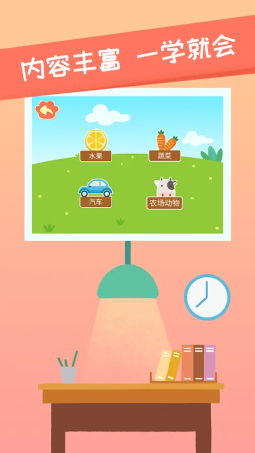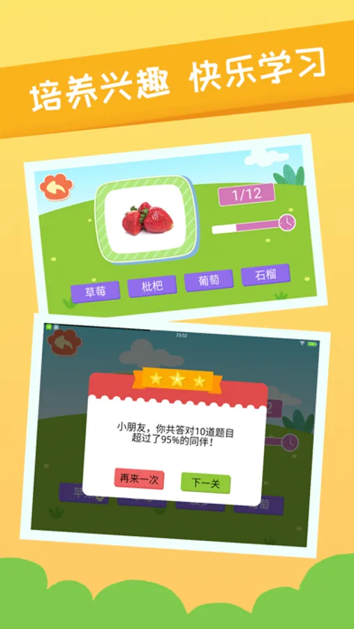 计时通关设计,准确错误提示,通过引入适度竞争,提升宝宝认知事物,学习汉字英文的主观能动性。