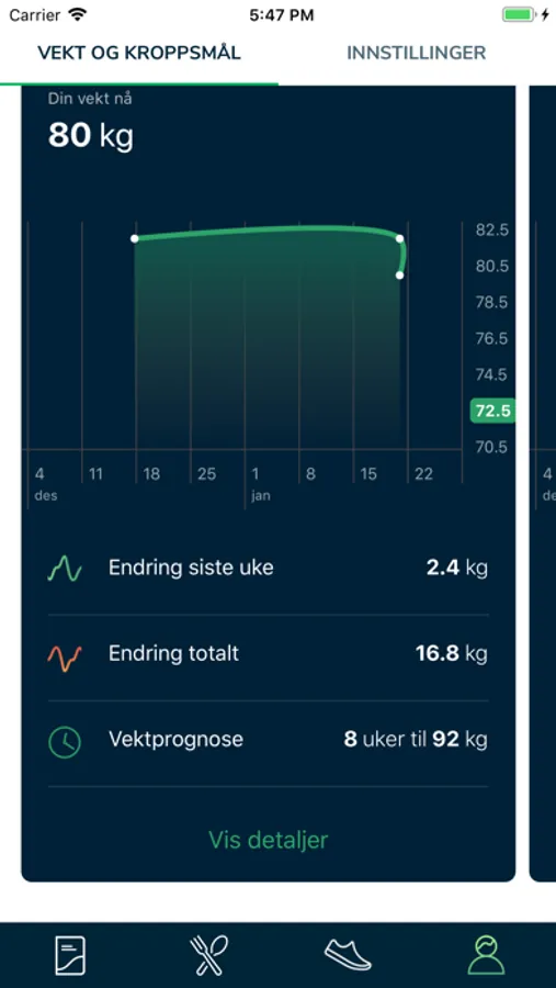 Du får også svar på hvor energitett maten din er, som sammen med oversikt over ditt totale energiinntak og -forbruk, gir deg de beste forutsetninger for at du får til et vekttap som blir varig.