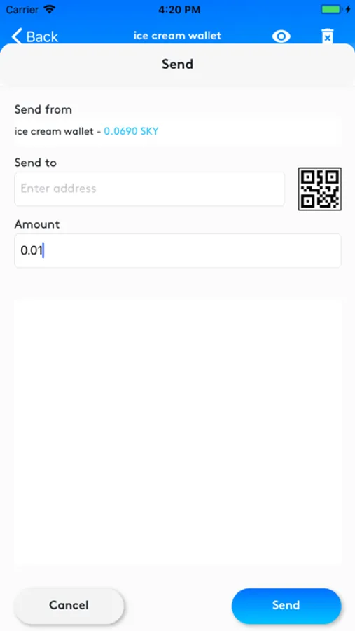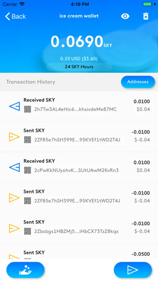 • Pay and accept Skycoin quickly with a QR-code scanner and generator;