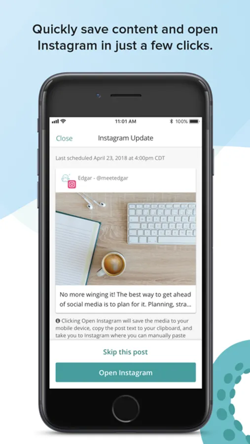 With the MeetEdgar app, businesses can stay up to date on all their social media content from their phone, no matter where they are or what they're doing. The Edgar app makes it easy for businesses to save their scheduled content and open Instagram in just a few clicks.