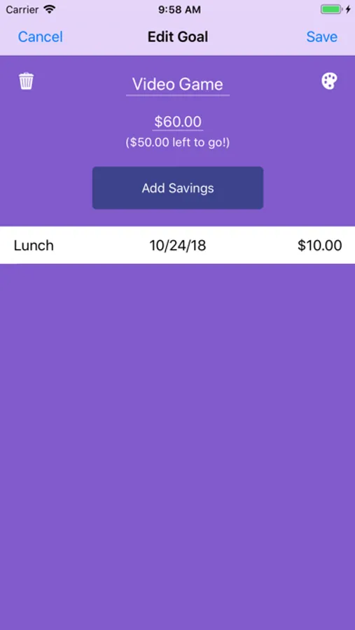 STEP 2: LOG your savings - each time you skip your morning coffee, pack your lunch, or do that car repair yourself, log the money you've saved towards your goal!