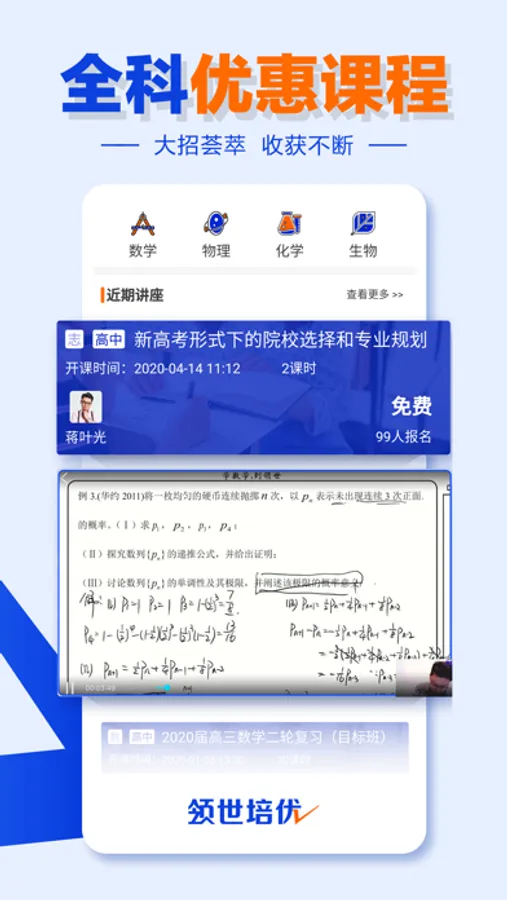 领世直播课课程涵盖了高中数学、物理、化学、语文、历史、生物、政治等多个学科的课程,更有自主招生、学科竞赛、高考志愿填报等专家解读和热点资讯。