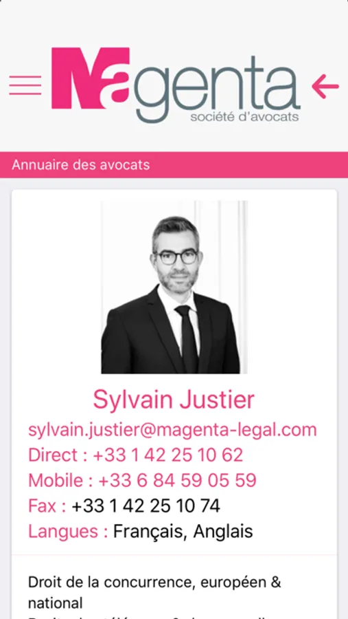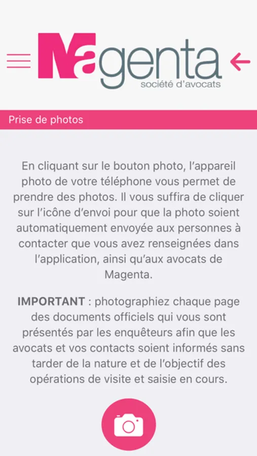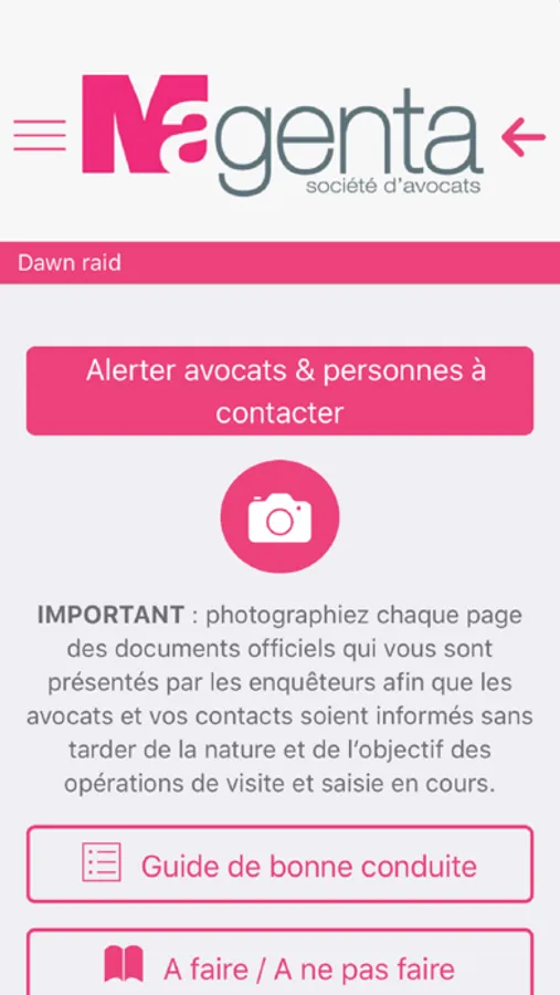Au-delà d’informations pertinentes sur Magenta et ses actualités, la Magentapp contient un outil d’assistance pour accompagner les entreprises confrontées à des perquisitions de concurrence, avec l’intégration de fonctionnalités avancées permettant d’interagir au sein de l’entreprise et avec ses conseils avec la plus grande réactivité : envoi automatisé du mandat ou de l’ordonnance définissant le champ des investigations à une mailing-list prédéfinie, email automatique d’informations des équipes, conseils pratiques à suivre pendant toutes les opérations, etc