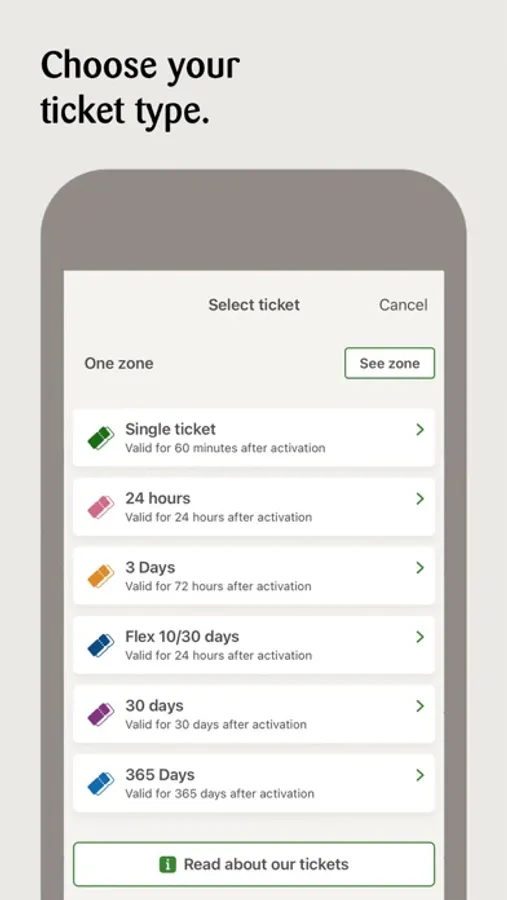 - Buy single, 24 hour, 30 day (one month travel cards) and 365 day tickets.