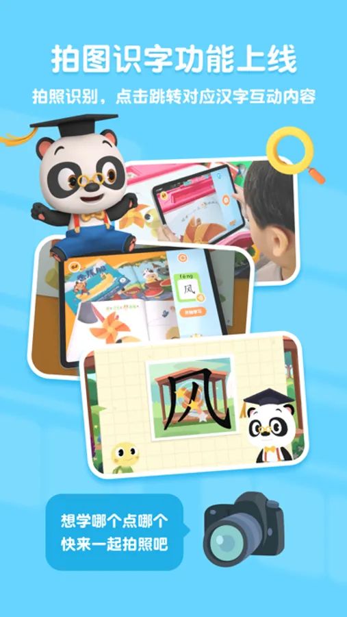 熊猫博士携手专业团队专为中国儿童打造的全新识字互动内容,通过科学的分级互动理念,让孩子在动画式剧情中发现汉字,在趣味的互动操作中认识汉字,再通过科学的记忆方式记住汉字。