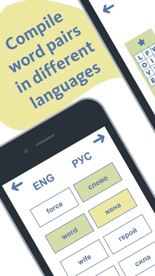 Any combination of languages. How many puzzles are there? Don't even try to count. More than just a translation. Single language is possible. Single language in word to word game – word associations. Single language in words in the grid game – the same words. Different languages - translation or close association. Three levels of difficulty. Difficulty of form and difficulty of content.
