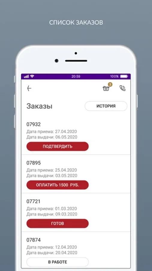 - посмотреть свои заказы в работе, их статусы, историю заказов;