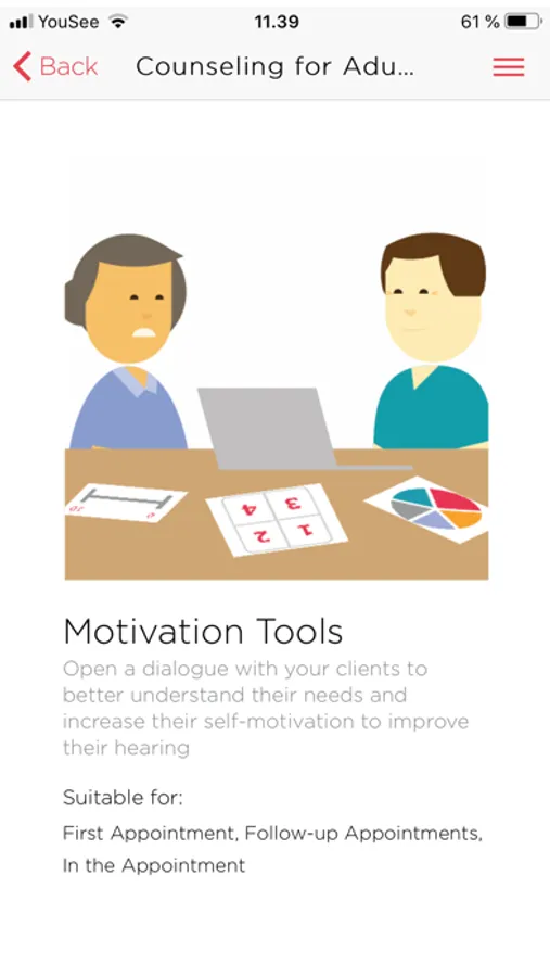 The Ida Tools help hearing care providers gain a better understanding of their clients’ needs and preferences and integrate person-centered care in their practices. Easily access and share relevant tools with your clients to prepare them in advance for their appointments.