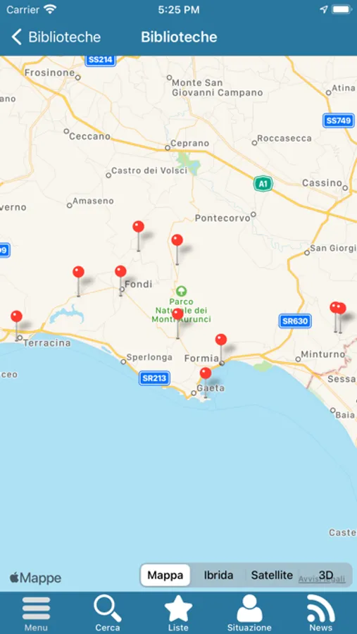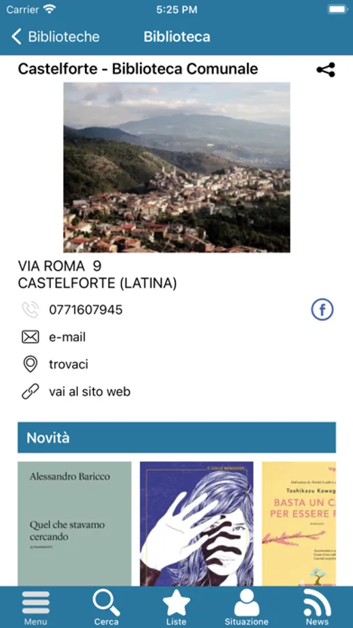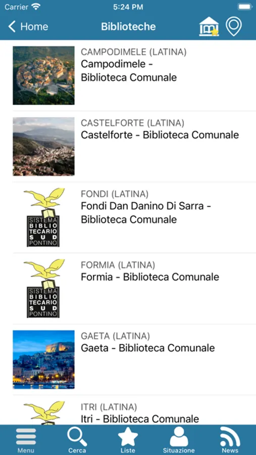 - visualizzazione biblioteche e mappa con tutte le biblioteche del Sistema Bibliotecario Sud Pontino e relative informazioni (indirizzo, orari…)