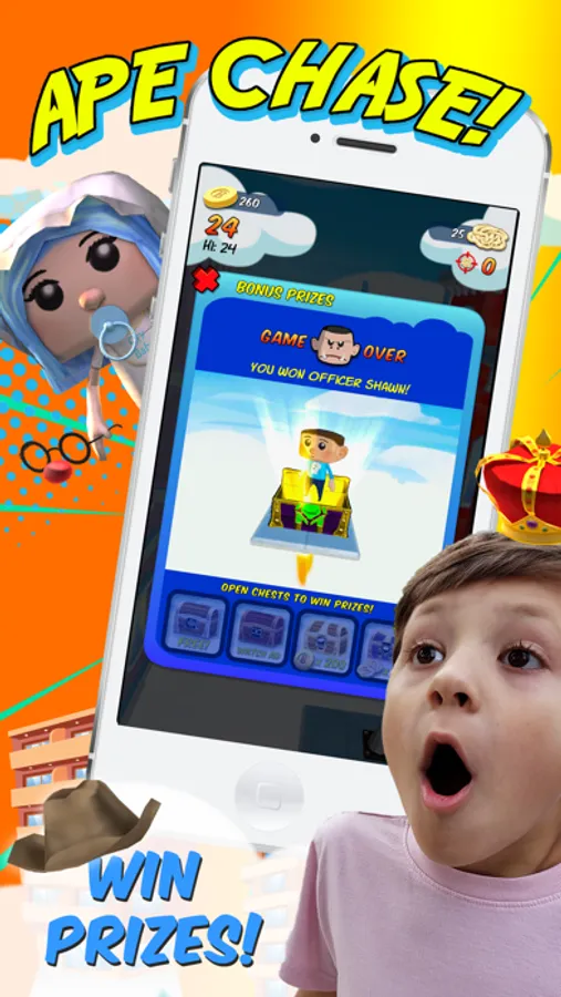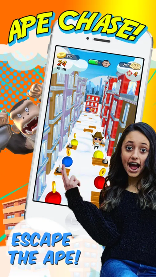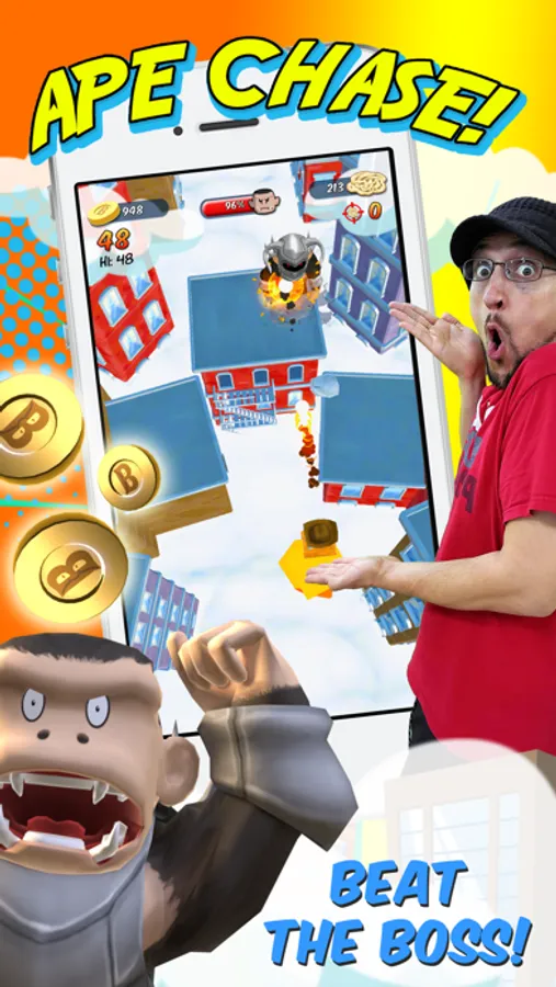 Simply drag your finger back and forth to safely land on platforms. Sound easy? Not so fast. Spikes, moving platforms and the ever looming distraction of the Ape in pursuit will challenge your quick reflexes and focus. Stay vigilant for the coveted laser pistol to turn the tables on the boss and subdue him in arena combat!