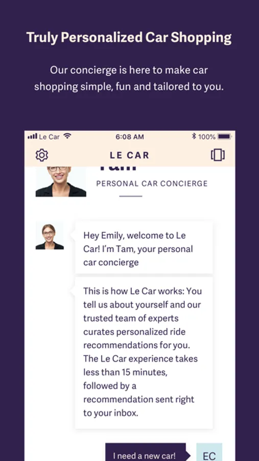 • Interact with the Le Car CONCIERGE. Whether you’re really ready to buy or just looking to learn more about your future vehicle match, think of Le Car as your own concierge, making a truly personalized recommendation for you.