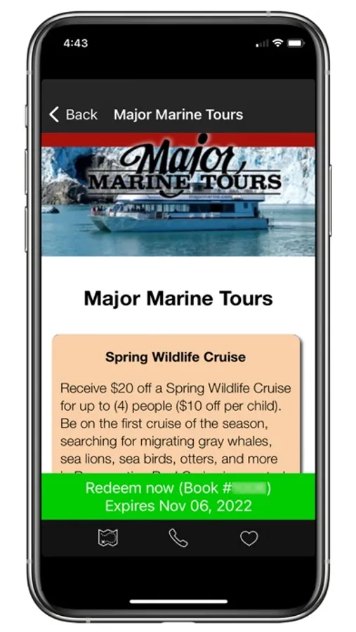 Instead of tearing out coupons from the print edition, the TourSaver® app allows you to press a "Redeem Now" button when a tour vendor asks you for a coupon.