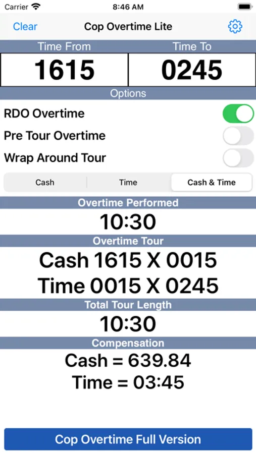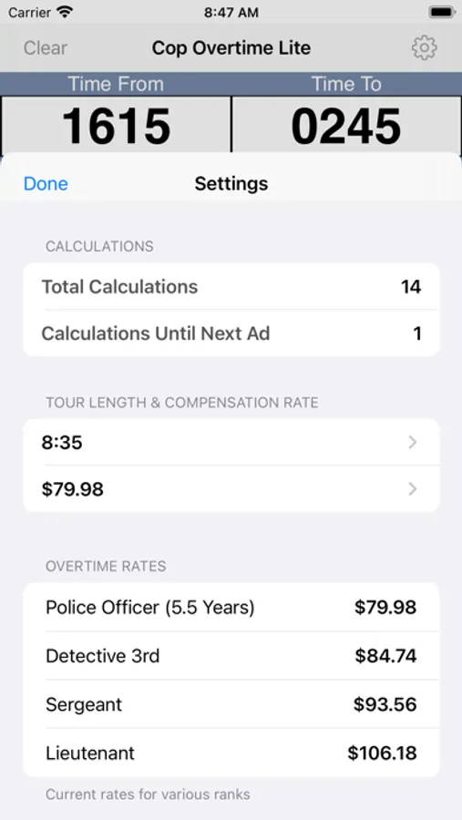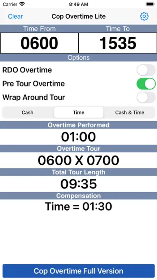 Cop Overtime Lite is a simple calculator that lets you quickly calculate your overtime. Especially handy when your doing odd tours and working odd overtime tours.