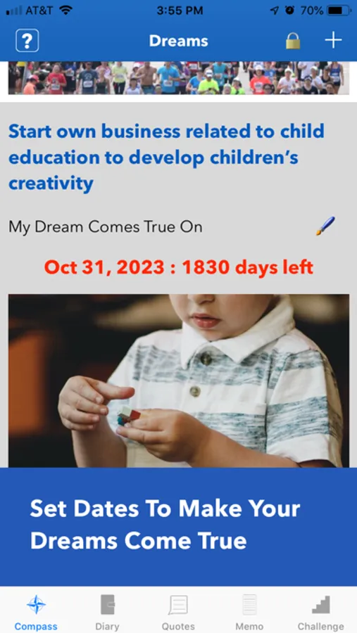Write your dreams and set the dates to make your dreams come true. Try to write your dreams as specific as possible. Add an image to help you visualize your dreams. You can add a dream by tapping + to start writing. Tap to select an image from your photo library.