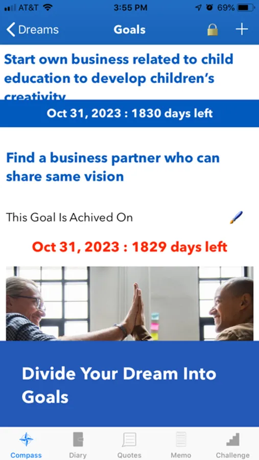 Think about what goals you must accomplish to make your dream come true. The goal should have a relationship of cause and result to your dreams,. The goal may be more than one. Maybe you need multiple goals to make the dream come true. List all goals that have to be achieved. Write your goals and set the dates to be achieved. Add an image to visualize your goal. To write goals, tap the dream and tap + on the Goals page to start writing. How to edit and delete are the same as Dreams page.