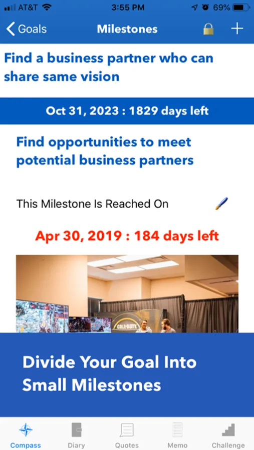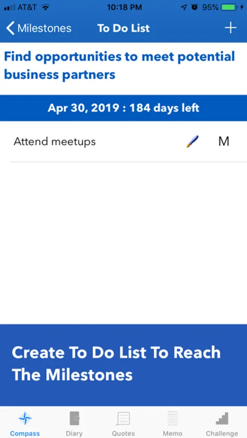 Think about what steps you need to take to achieve the goal. Divide the goal into small milestones and set the date to each milestone. The milestones must be measurable. Set specific numerical target on each milestone. To write milestones, tap the goal and tap + on the Milestones page to start writing. How to edit and delete are the same as Dreams page.