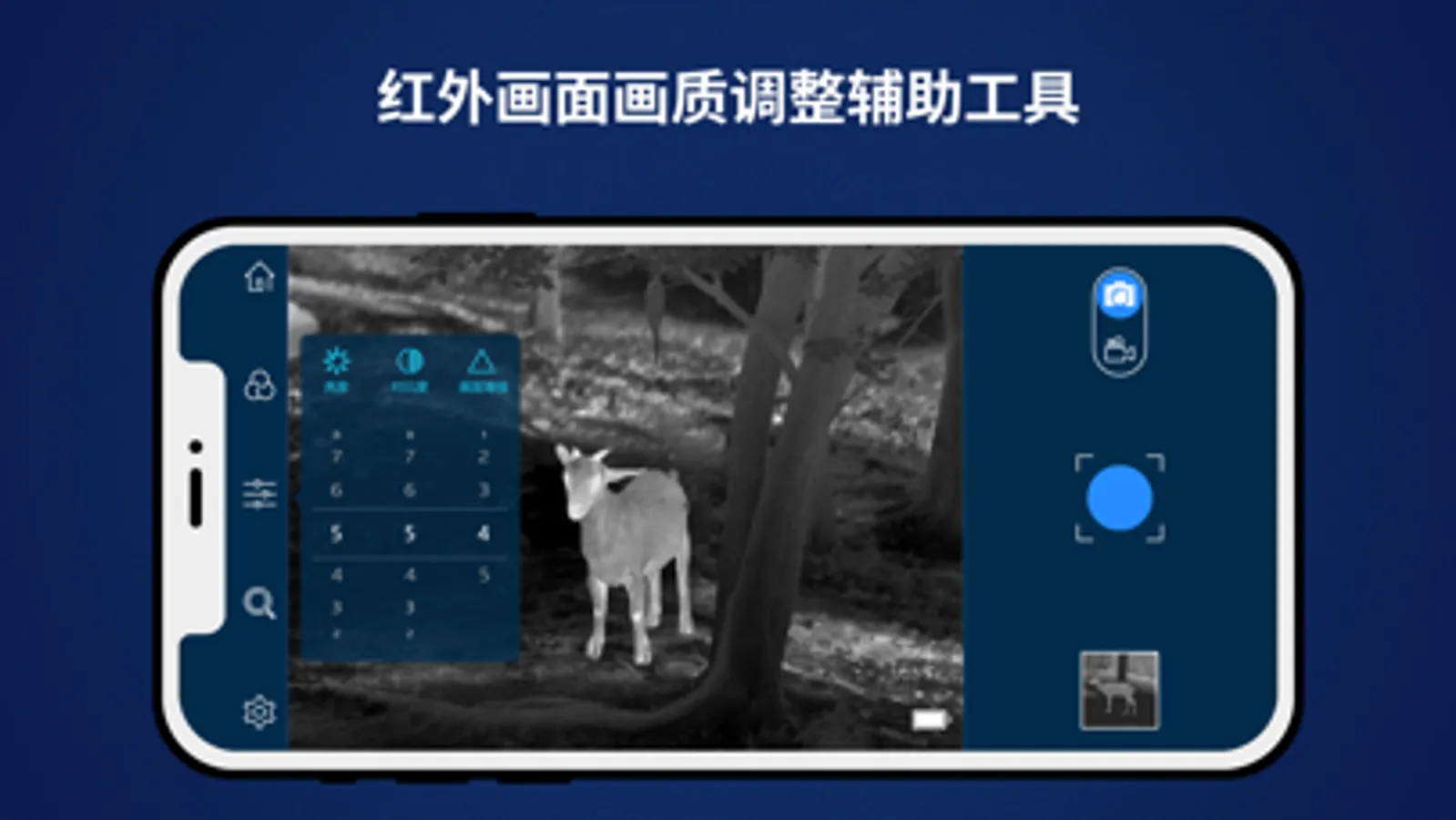 1.可调节热像仪实时画面的放大/缩小、伪彩、图像亮度、图像对比度、画面增强等功能调整;