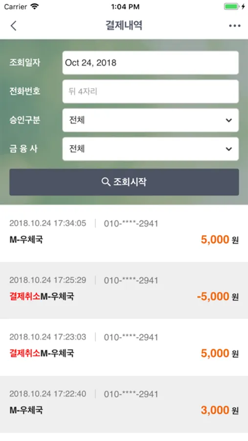 일자 별, 고객 전화번호 별, 결제승인/취소 별로 조회하여 고객의 결제내역을 언제든지 확인 가능합니다.