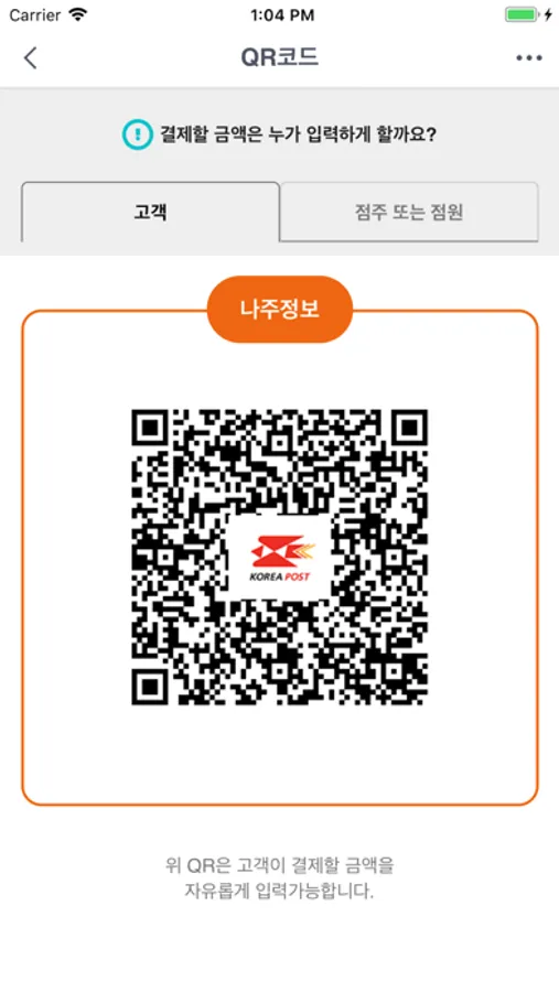 가맹점의 QR코드를 모바일 화면에 띄울 수 있어 매장에서 이동중에도 고객의 QR코드결제 요청에 응대할 수 있습니다.