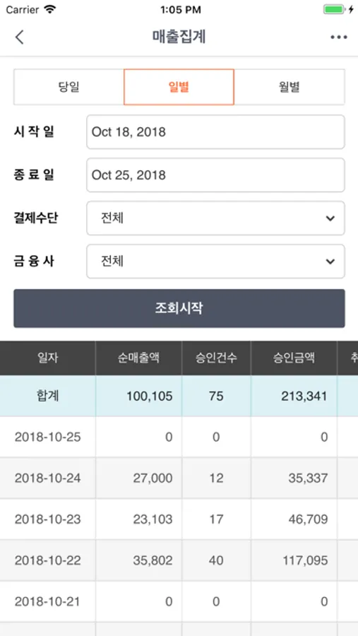 당일, 일별, 월별로 매출집계가 가능하며 매출액, 승인건수, 승인금액, 취소건수, 취소금액이 한 번에 집계됩니다.