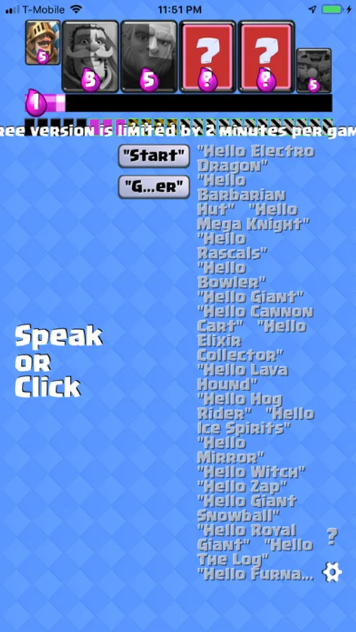 2. When you start a CR game, press 'Start' button or say 'start'. The 'assistant' will start recording cards and simulating the elixir bar status;