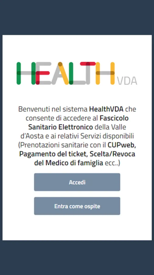 L'applicazione HealthVDA consente l’accesso ai servizi del Fascicolo Sanitario Elettronico della Valle d'Aosta e rende disponibile il servizio CUPweb per la consultazione, prenotazione e pagamento online delle prestazioni sanitarie.