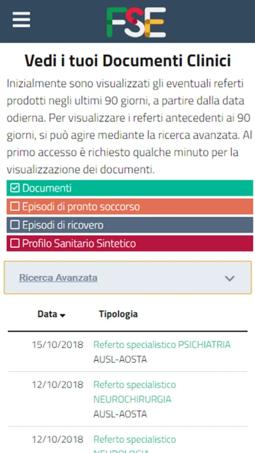 - Consultazione dei documenti clinici elettronici emessi dall'Azienda USL della Valle d'Aosta e dagli Enti Convenzionati: Lettere di dimissione ospedaliera, Verbali di pronto soccorso, Referti di radiologia, Immagini di radiologia, Referti di laboratorio analisi e microbiologia, Referti ambulatoriali, Referti di anatomia patologica, Lettere di fine trattamento radioterapico, Verbali atti operatori, Lettere dimissione Day Hospital, Lettere di accesso Day Hospital, Documenti in regime esterno e interno