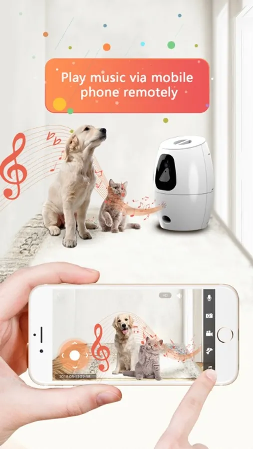 8.With loop recording function. Record precious video for your pets in 24 hours incessantly and stored in TF card. You can review video as per the recording time on mobile phone.