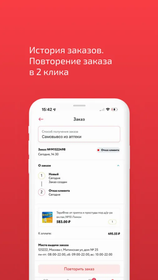 • Для большего удобства заказа — «Любимая аптека». В приложении есть возможность заранее выбрать любимую аптеку и оформить заказ (или доставку) с учетом наличия препаратов в ней.
