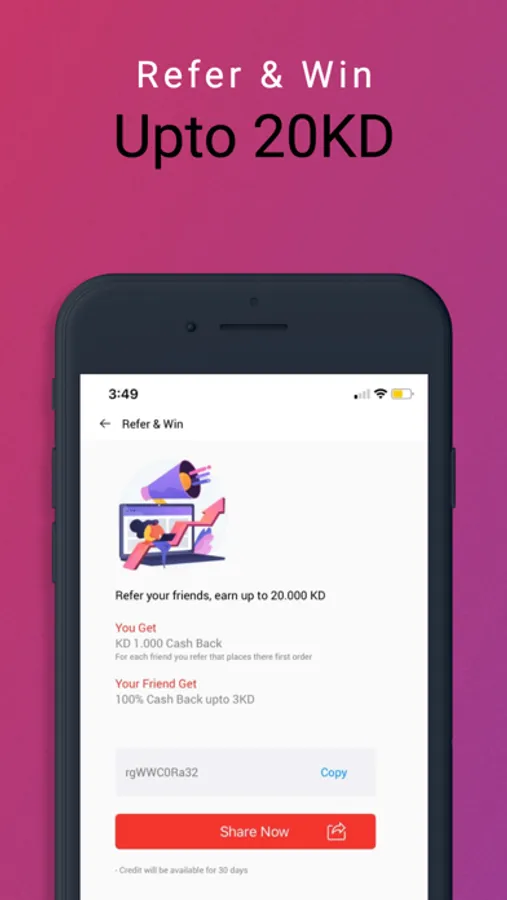 Refer your friends and win up to KD 20 when they place their first order! Your friend gets 3KD Off– Now, this is a win-win situation!