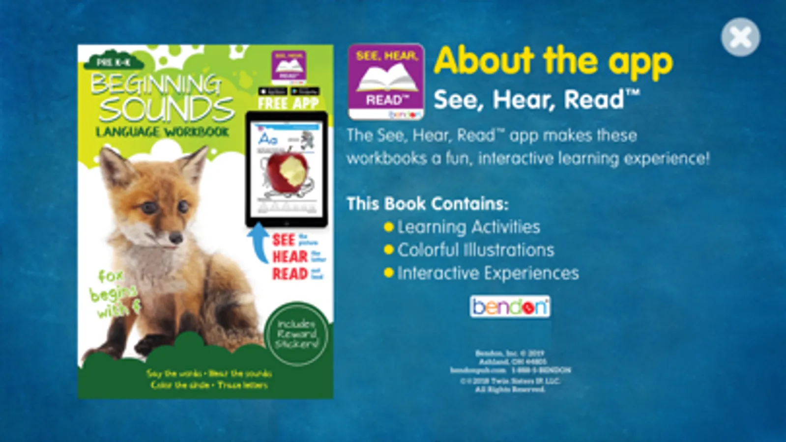 “See, Hear, Read” by Bendon® lets kids experience a whole new dimension in learning. These engaging interactive workbooks provide a unique interactive experience to reinforce the basic skills taught in each one. Kids will delight as they learn the alphabet and then see each letter come to life by seeing a photograph, hearing the letter sound, and reading the letter. Unique interactive experiences are provided in each workbook to teach and reinforce: the alphabet, letter sounds, phonics, math problems, Spanish words, beginning reading, and more! This FREE, easy-to-use app works with any of the workbooks in the “See, Hear, Read” series. Just download the app to your mobile device, launch the app, and then hold the device over each page that has the special “See, Hear, Read” icon to experience the excitement.