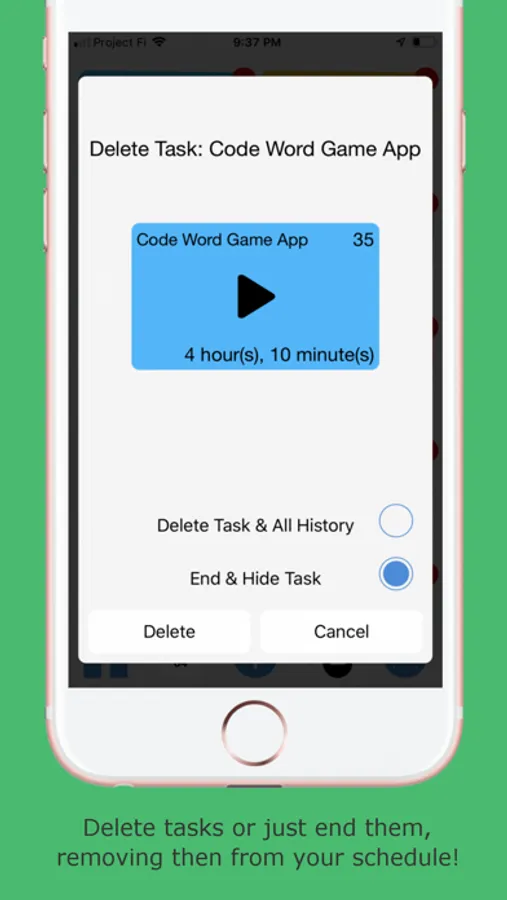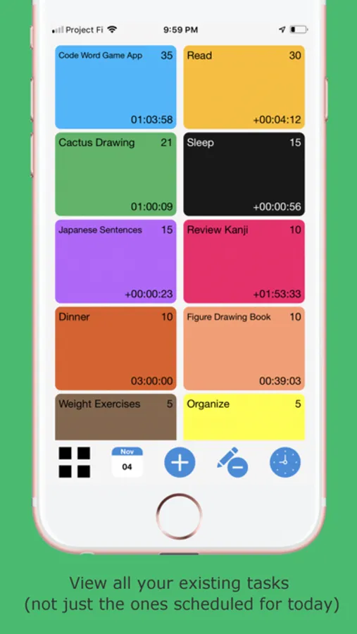 -go to the activities tab and view your daily activity for any day in a beautiful 24-hour animating clock color-coated to your tasks.