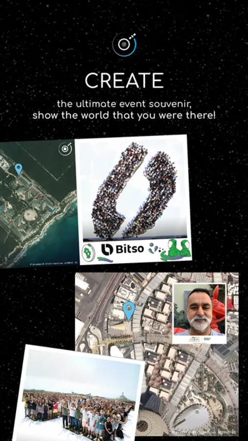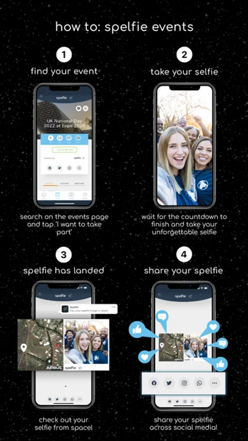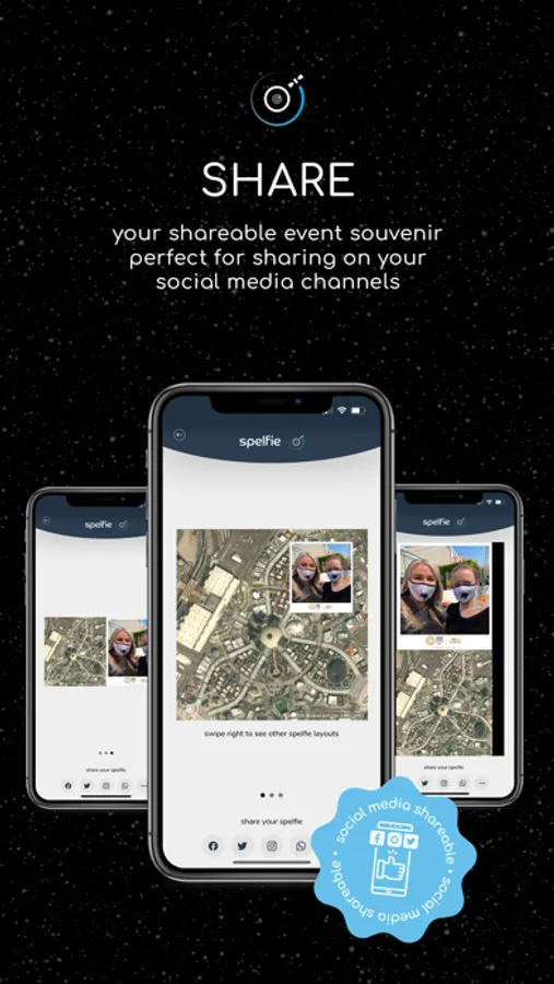 Your unique event moment is captured forever with your selfie from space. Create a legacy and capture memories like never before. In the selfie app you can relive all your spelfies again and again!
