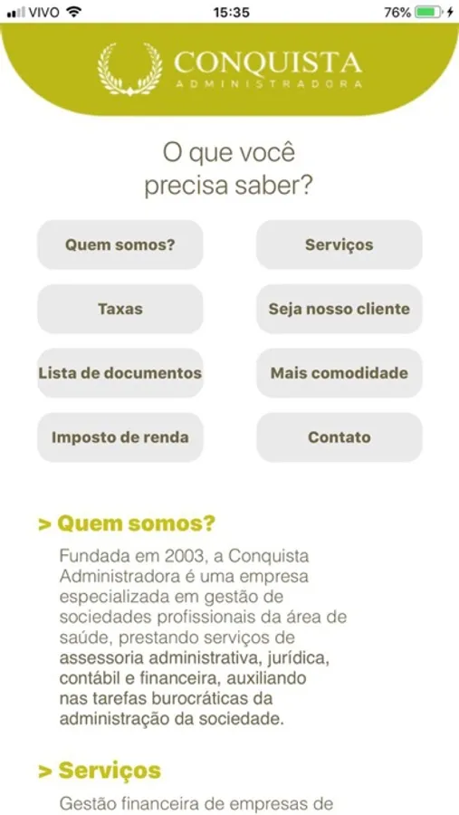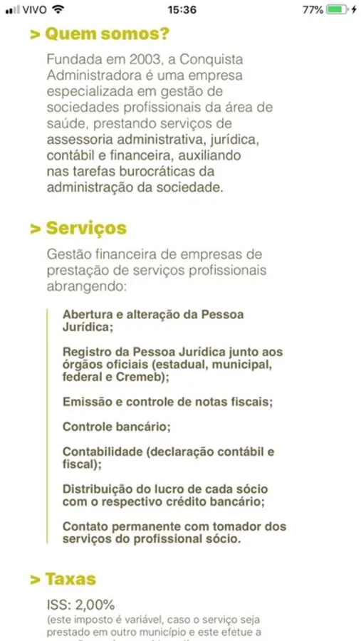 Fundada em 2003, a Conquista Administradora é uma empresa especializada em gestão de sociedades profissionais entre médicos, prestando serviços de assessoria administrativa, jurídica, contábil e financeira, assumindo todas as tarefas burocráticas da administração da sociedade.