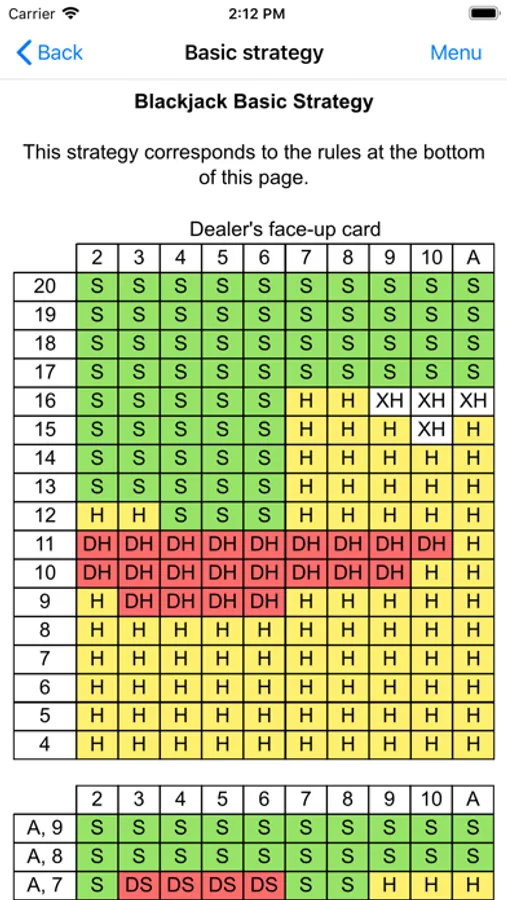 Different casinos have different rules for blackjack, and that can affect basic strategy. Blackjack Shark contains the correct strategy for every possible set of rules. Just enter your casino's rules in the "Rules" sub-menu and Blackjack Shark will show you the correct strategy. If you want to refer to the strategy at a casino table, you can e-mail it to yourself and print it out from a computer, or you can print it out directly from the app via AirPrint.