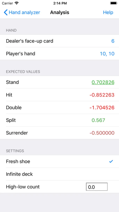 If you're at 16 and the dealer is showing a 10, is it REALLY that important for you to hit instead of stand? Now you can find out with Blackjack Shark's hand analyzer. Type in any scenario you want and Blackjack Shark will calculate the expected value of every possible action, instantly.