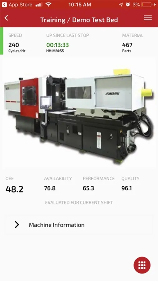 Owners of Milacron machines can remotely monitor the productivity of their machines using this app. Key performance indicators supporting best practices in lean manufacturing such as Operational Equipment Effectiveness, OEE, are incorporated.