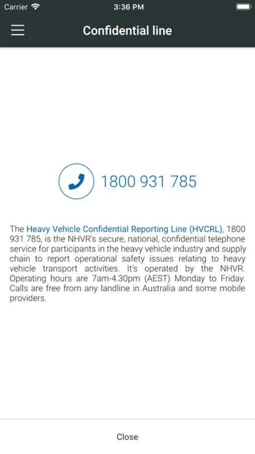 The NHVR Registration Checker app has been developed for industry and the public to undertake registration checks for heavy vehicles over 4.5 tonne. The app enables industry to undertake basic safety checks by enabling them to view key information about a heavy vehicle. Key information includes registration status, vehicle make, model, colour, GVM or GCM and the National Charge Code for the registered vehicle. It also includes Accreditation module and labels or Performance Based Standards (PBS) approval information where vehicles are enrolled in the NHVR's Accreditation scheme and PBS scheme. Users of the app can also call the Heavy Vehicle Confidential Reporting Line to report operational safety issues related to heavy vehicle transport activities via the app.