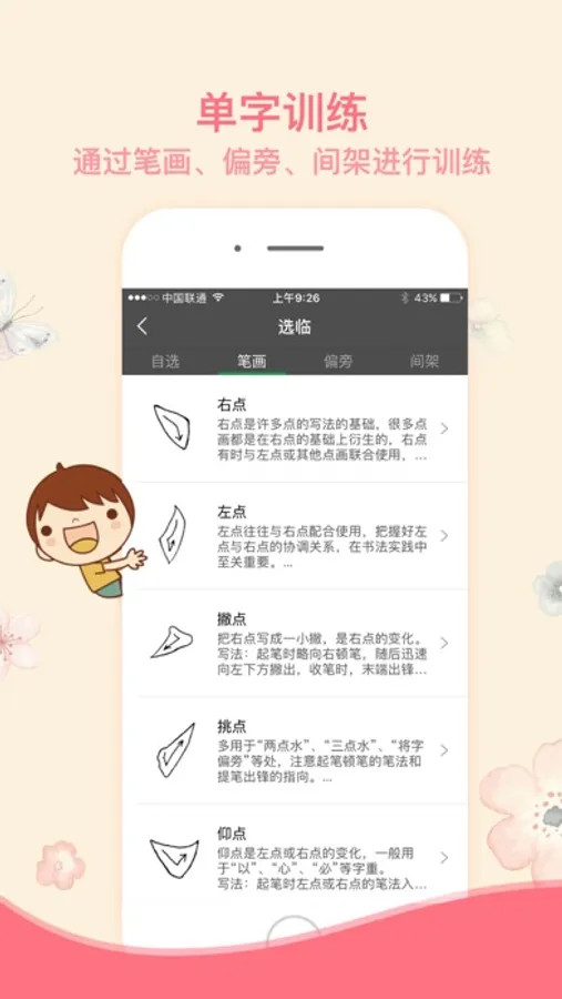 对每一部碑帖,用户都可以通过笔画学习掌握笔法技巧;通过偏旁学习掌握同一偏旁字的书写,触类旁通;通过间架结构的学习把握整体字型的书写。