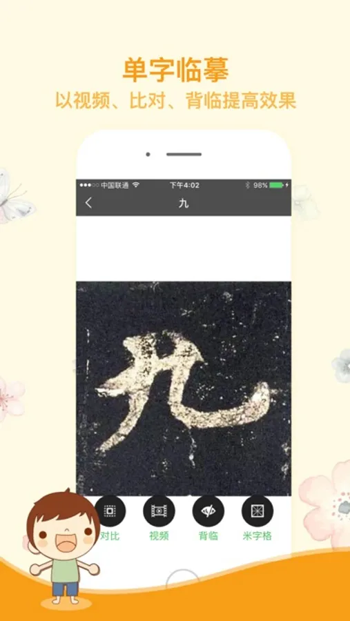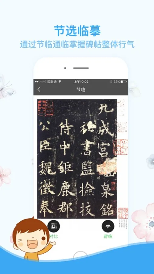 对临要求与原帖尽量相似,针对传统碑帖缺少米字格的问题,应用中每个单字都可以添加米字格进行对临;可以对字的大小进行缩放,以适应用户实际书写的大小;同时用户可以拍照拖放与原帖进行比对,查找不足。