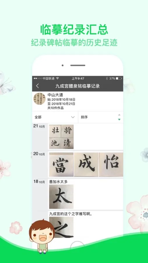 精临书法应用提供了时间线、碑帖多维度的临习记录汇总,帮助用户记录书法学习和逐步提高的足迹。