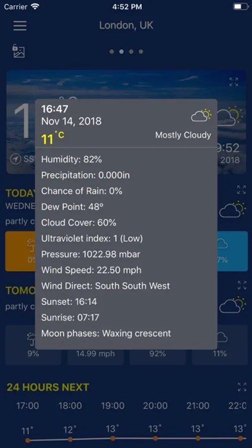 - Show the current weather with: Temperature, humidity, fog, sunshine, rain, UV index, wind icon, pressure, sunrise / sunset.